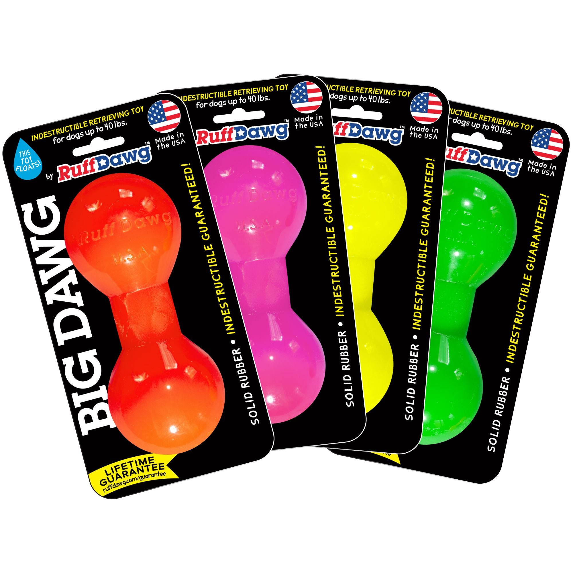 Ruff Dawg solid rubber Big Dawg toy for retrieving is Guaranteed. Ultra durable, bouncy, barbell-shaped toy dogs love to fetch and carry. 100% Made safe in the USA of solid FDA-approved, recyclable rubber. Free of phthalates, latex, and BPAs. Gentle on teeth and gums, weatherproof, washable, dishwasher-safe. Floats for water retrieval.