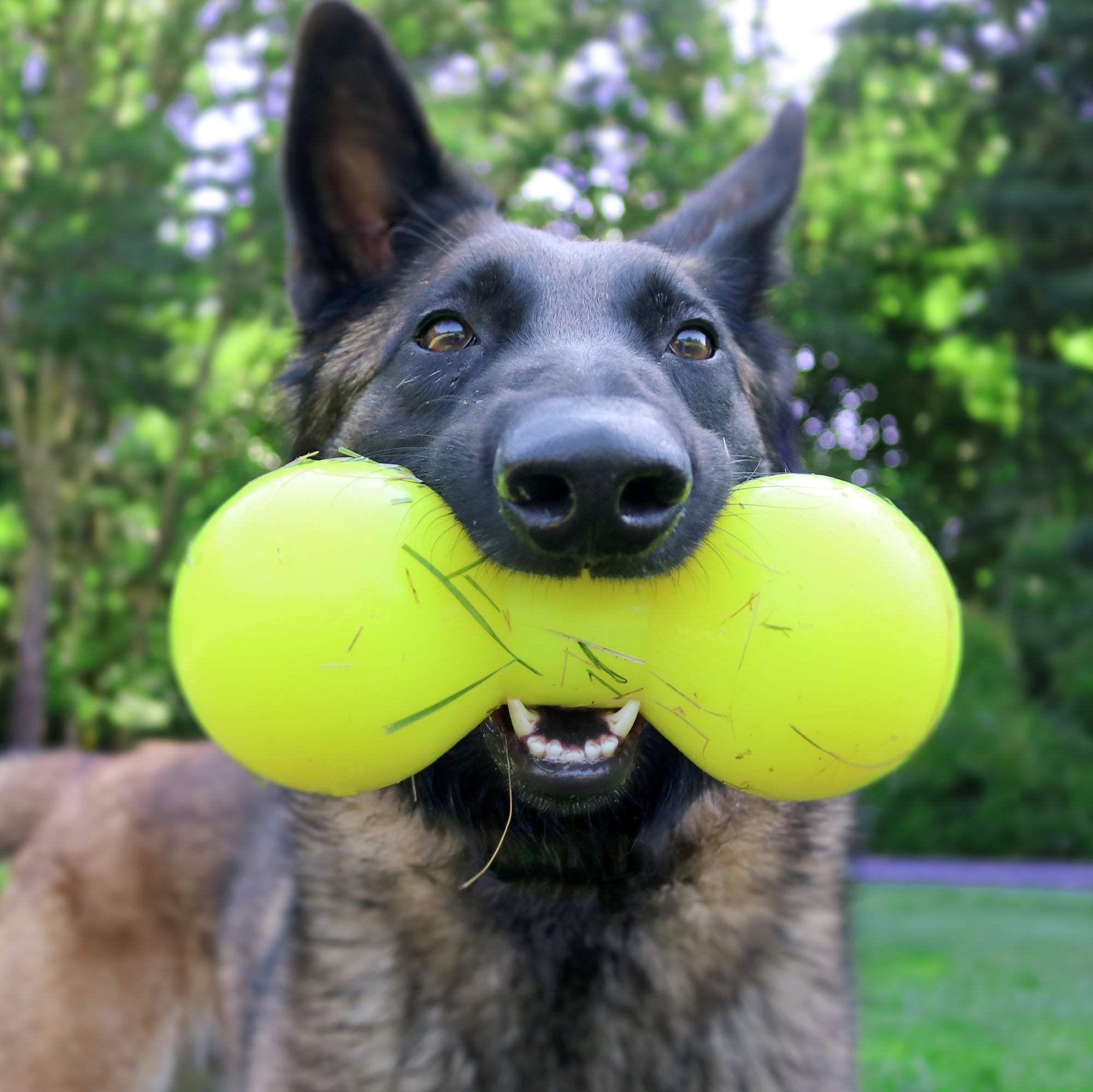 Ruff Dawg solid rubber Big Dawg XL toy for retrieving is Guaranteed. Ultra durable, bouncy, barbell-shaped toy dogs love to fetch and carry. 100% Made safe in the USA of solid FDA-approved, recyclable rubber. Free of phthalates, latex, and BPAs. Gentle on teeth and gums, weatherproof, washable, dishwasher-safe. Floats for water retrieval.
