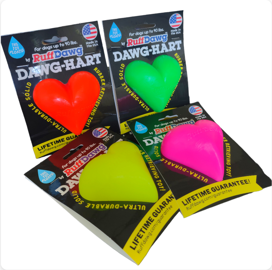 Ruff Dawg solid rubber Dawg Hart for retrieving is Guaranteed. Super-bouncing. 100% Made safe in the USA of solid FDA-approved, recyclable rubber. Free of phthalates, latex, and BPAs. Gentle on teeth and gums, weatherproof, washable, dishwasher-safe. Floats for water retrieval.