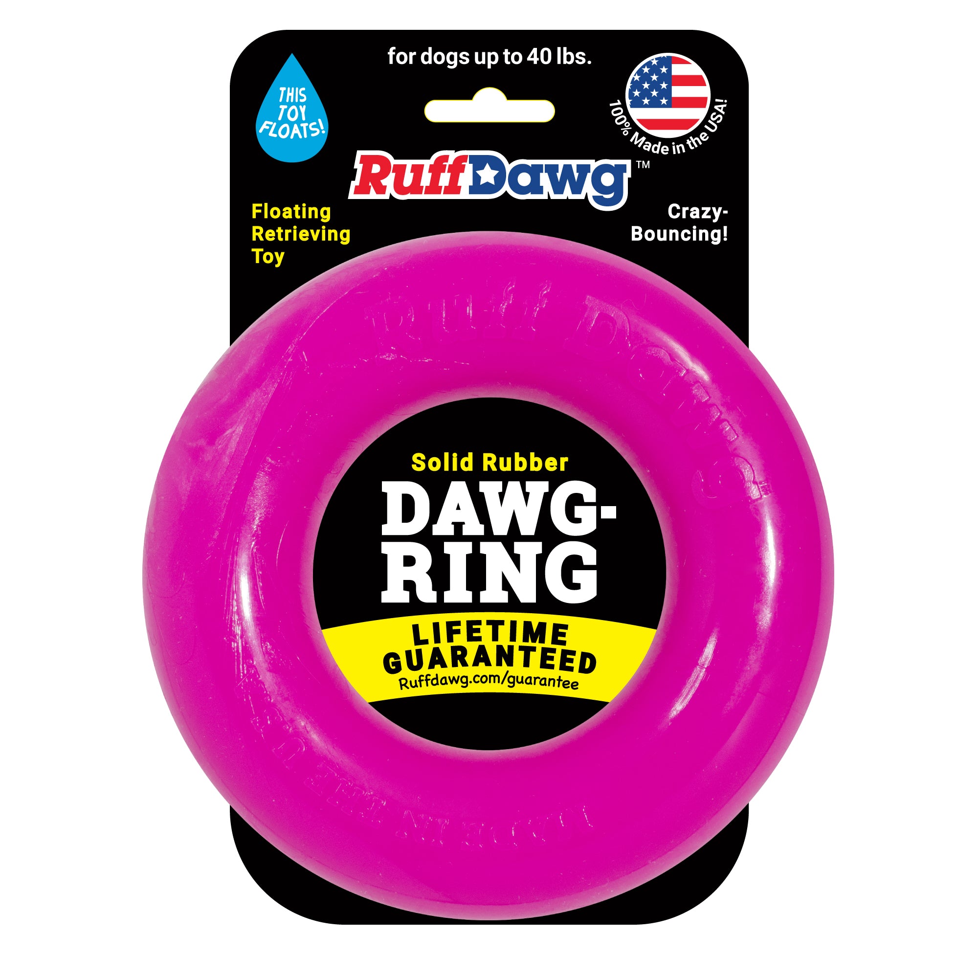 Ruff Dawg solid rubber Dawg Ring for retrieving is Guaranteed. Super-bouncing. 100% Made safe in the USA of solid FDA-approved, recyclable rubber. Free of phthalates, latex, and BPAs. Gentle on teeth and gums, weatherproof, washable, dishwasher-safe. Floats for water retrieval.