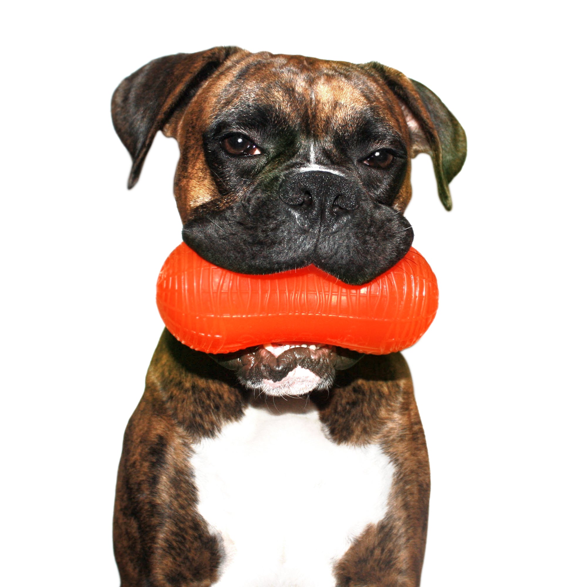 Ruff Dawg Peanut Crunch retrieving toy is a giant peanut-shaped noise-making toy, that makes crunchy sounds when dogs bite down. Weatherproof, washable, floats for water retrieval. Textured barbell shape is a favorite to fetch and carry! High visibility Neon colors won't get lost in the grass or water. Gentle on teeth and gums. 100% Made safe in the USA of solid FDA-approved, recyclable rubber, with a Mylar lining. Free of phthalates, latex, and BPAs.